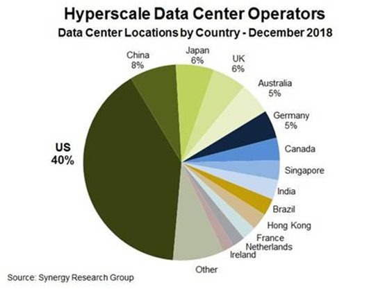 美國繼續在超大規模數據中心設施方面占據世界領先地位,占總數的40%左右,但其主導地位正在逐步下降,美國在2016年底占45%,2017年底占43%。